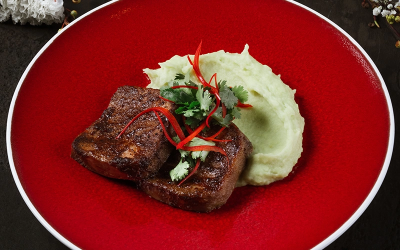 Говяжий язык, запеченный под соусом Black Pepper, с пикантным картофельным пюре с васаби.