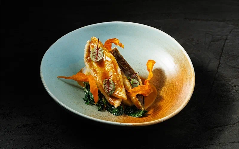 Филе камбалы с мягким тофу в морковном соусе, с азиатской заправкой, свежим пак-чоем, шпинатом и морковью.