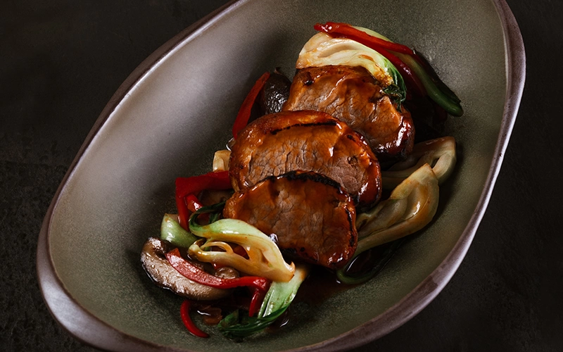 Свиная вырезка с овощами, запеченная в соусе Гобаджоу.