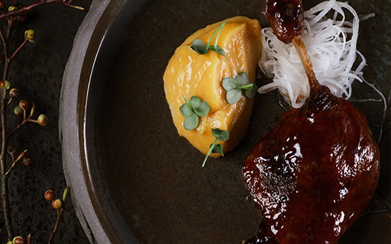 Утиная ножки конфи, запеченная в соусе Хаосин, с пюре из батата