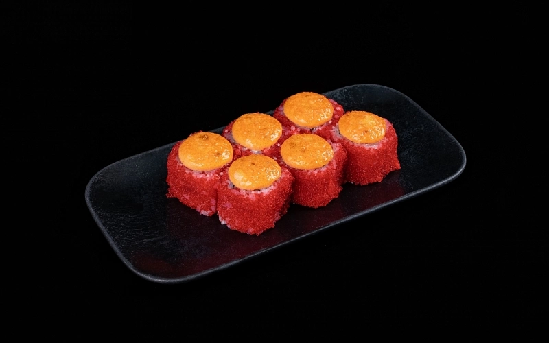 Нежный ролл с начинкой из тигровой креветки, сливочного сыра и огурца, запечённый под шапкой из пикантного соуса и сыра пармезан