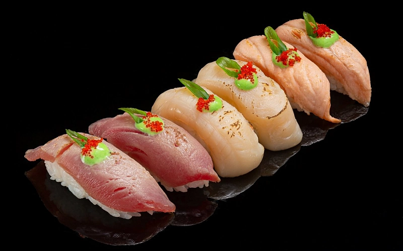 Суши из лосося, гребешка и тунца обжигаются на открытом огне, поливаются японским соусом со вкусом васаби и подаются с подкопчённой красной икрой