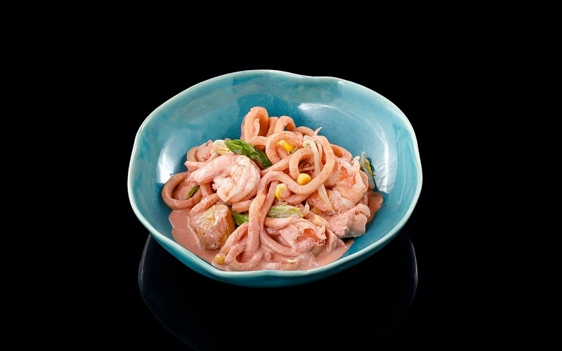 Японская пшеничная лапша — с лососем, гребешком и тигровыми креветками в сливочном соусе