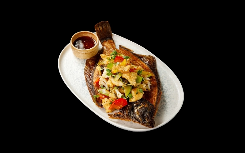 Пряный вкус обжаренной до хрустящей корочки камбалы, сельдерея, болгарского перца и цветной капусты с ароматом тимьяна