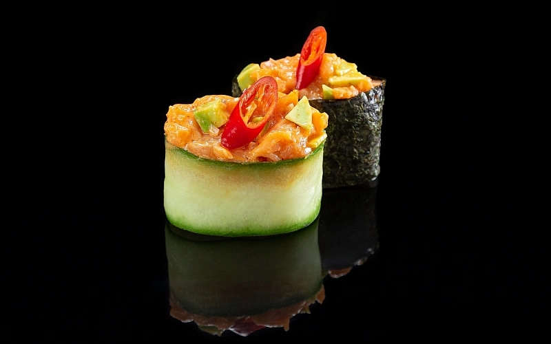 Гункан с охлажденным лососем и ломтиками авокадо в соусе спайси