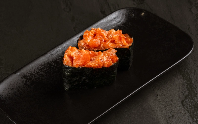 Гункан с лососем и острым соусом