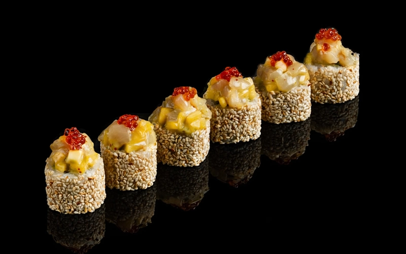 Урамаки с начинкой из нежного авокадо и хияши вакаме, с шапкой из приморского гребешка в сочетании со сладким манго в соусе сом там.