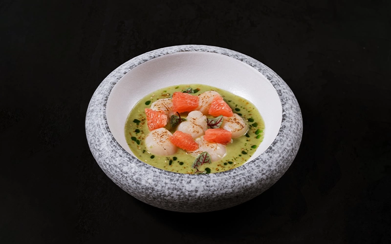 Нежные морские гребешки с золотистой корочкой, свежий и пикантный соус Сом Там, сочный грейпфрут и ароматная приправа Фурикаке. Всё это с легким травяным оттенком масла тархун и свежей микрозеленью щавеля
