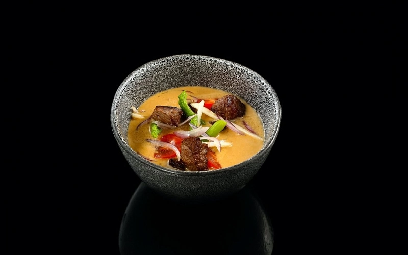 Авторский суп от бренд-шефа Zuma. Насыщенный говяжий бульон с горчицей и розмарином, вырезкой молодого ягненка, помидорами черри, спаржей и корнем сельдерея