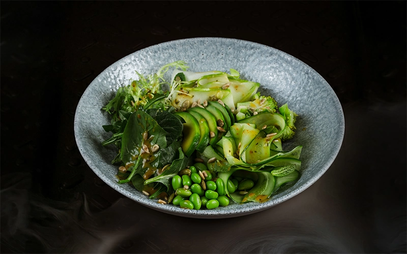 Салат из свежих овощей, микс-салата, нежного авокадо, бобов эдамаме, листьев мяты и семечек. Подаётся под лёгким мятным соусом