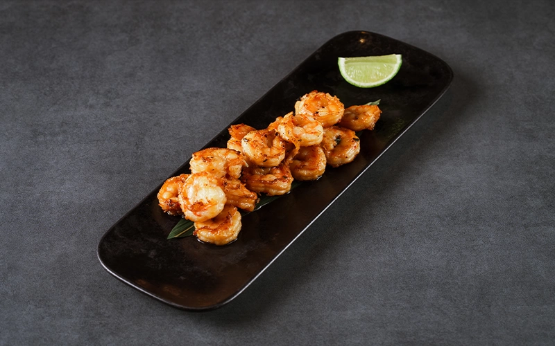 Крупная креветка маринуется в белом вине с луком, чесноком, тимьяном и креветочным соусом и обжаривам на гриле до золотистой корочки.