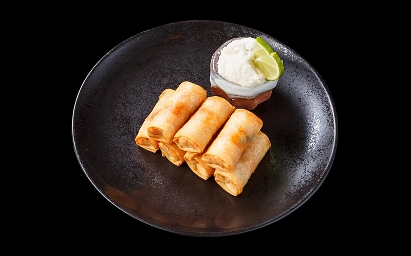 Спринг роллы в тонком хрустящем тесте с начинкой из тигровой креветки, сливочного сыра и молодого горошка