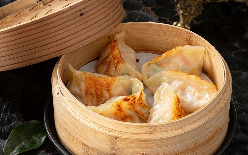 С тигровыми креветками, овощами и зеленым горошком. Обжариваются на кунжутном масле до хрустящей корочки и подаются с соусом на основе саке и рисового уксуса с кунжутом