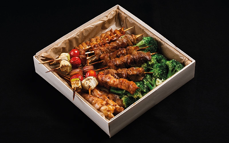 Ассорти из шашлычков кальмара, курицы и свинины, дополненное овощными шпажками и брокколи.