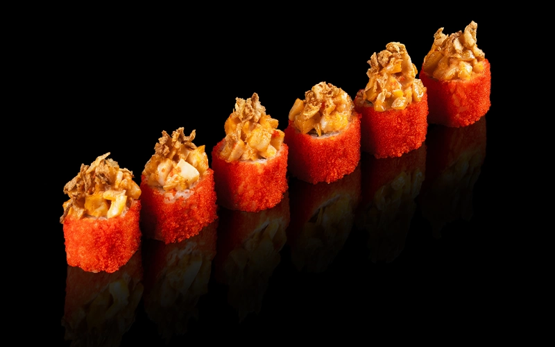Урамаки с начинкой из омлета, творожного сыра и огурца, с шапкой из трубача с добавлением спайси соуса. Украшается хрустящим жаренным луком.