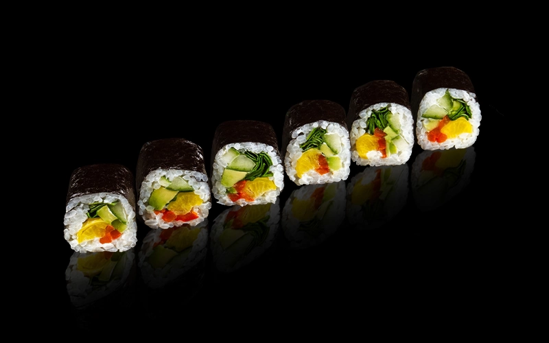 Ролл с яркой овощной начинкой из болгарского перца, шпината, огурца и авокадо, дополненный кислинкой такуана