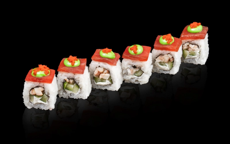 Ролл с начинкой из осьминога, творожного сыра и огурца, с добавлением слайсов тунца и соуса васаби