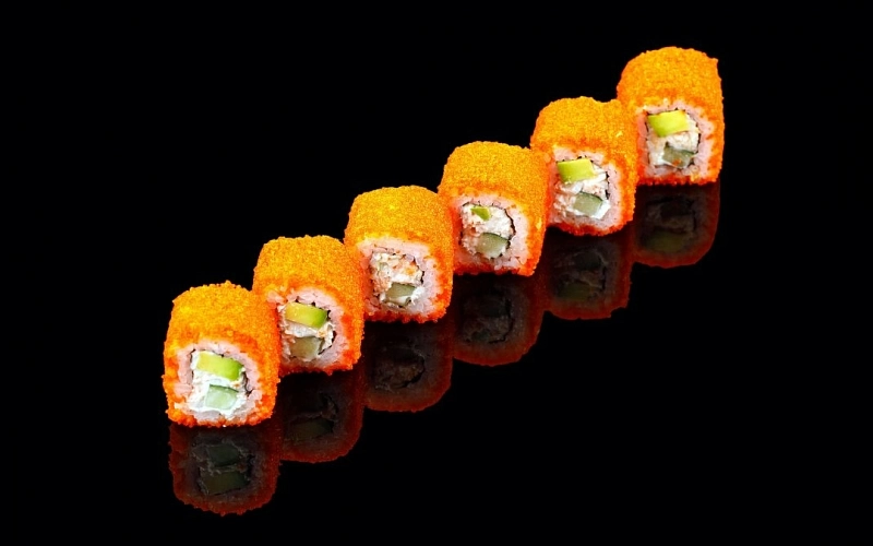 Урамаки с мясом камчатского краба, маслянистым авокадо, огурцом и икрой летучей рыбы