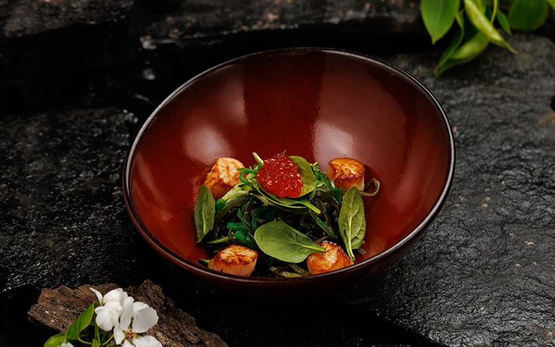Икра, гребешки, морская капуста, огурцы, шпинат, хияше вакаме.