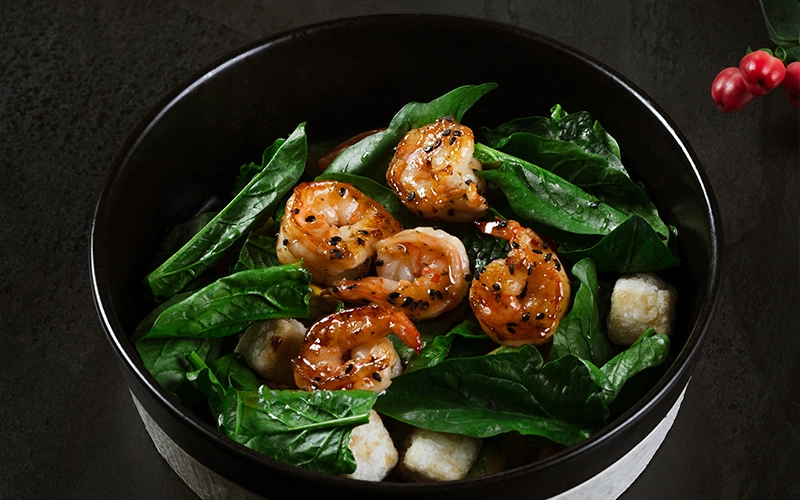 Хрустящие креветки с салатом из шпината, авокадо, жаренным тофу и пикантными огурчиками с азиатским соусом.