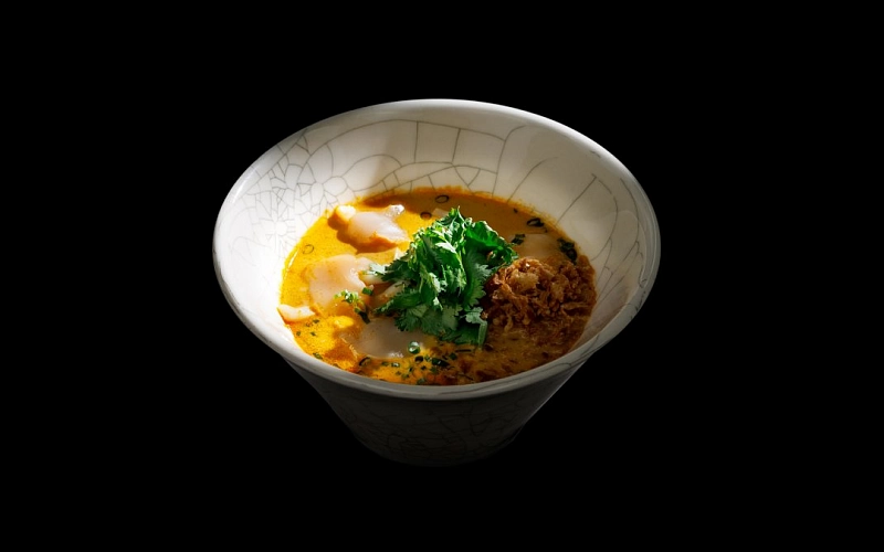 Густой куриный бульон с сыром чеддар. Приморский гребешок, кальмар, шелковый тофу и хрустящий жареный лук.