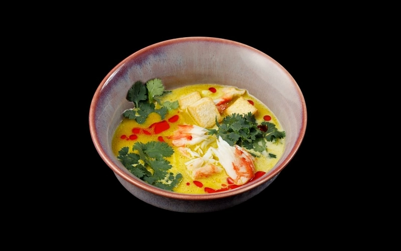 Блюдо перанаканской кухни — острый пряный суп на рыбном бульоне с кокосовым молоком, тонкой пшеничной лапшой, фалангой краба, красным перечным маслом и кинзой.